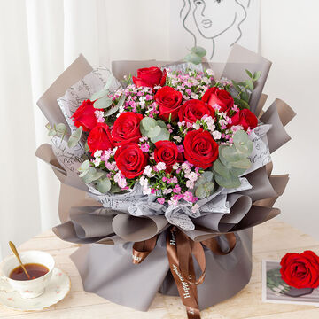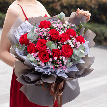 11枝红玫瑰搭配粉色相思梅、尤加利叶