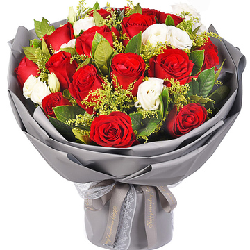 19枝精品红玫瑰,白桔梗丰满间插,黄莺、栀子叶间插