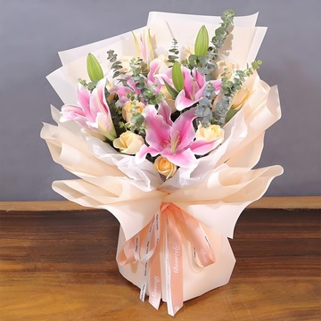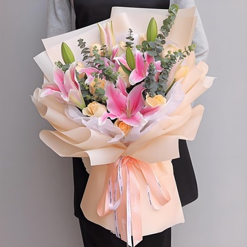 11朵精品香槟玫瑰,2枝多头粉百合,尤加利间插