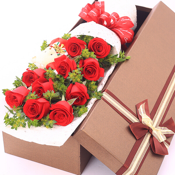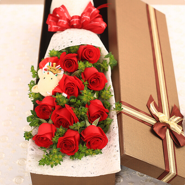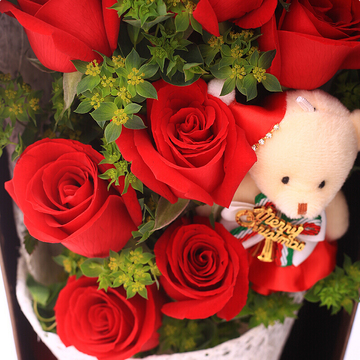 精选11朵优质红玫瑰,叶上黄金(或黄莺),1只小熊搭配。