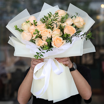 白色雪梨纸内衬+香槟色韩素纸外层包装,白色缎带束扎。花语:为你描绘幸福的图画,不必害怕风吹雨打,请相信,幸福逐渐到来附送:
