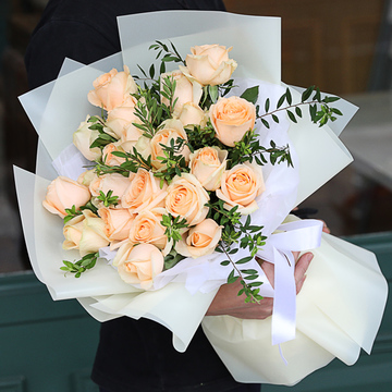 19支香槟玫瑰,搭配适量细叶尤加利叶装饰。