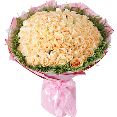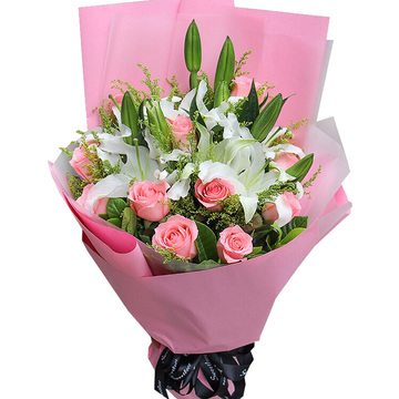 9朵香槟玫瑰,3枝多头粉百合,白色洋桔梗搭配,黄莺、栀子叶点缀