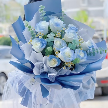 浅蓝色欧雅纸层次扇形包装,黑色英文缎带束扎花语:不是每个相遇的人都能相识,不是每个相识的人都能相知相惜。若相遇,请相知;若相知,请相守;若相守,请相惜!附送: