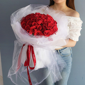 白色韩素纸+白纱包装,红色英文缎带束扎花语:情意绵绵心相牵,日月轮转永不断,情若真挚长相伴,无论海角或天涯,甜蜜温馨驻身边!附送: