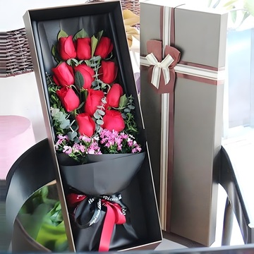 红玫瑰11朵,栀子叶丰满间插,尤加利点缀,粉色石竹梅搭配