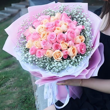 17朵戴安娜粉玫瑰,16朵香槟玫瑰,白色满天星丰满围边