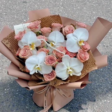 3朵向日葵,5朵香槟玫瑰,3枝多头橙色泡泡玫瑰,1枝多头白色洋桔梗,尤加利叶、小菊点缀