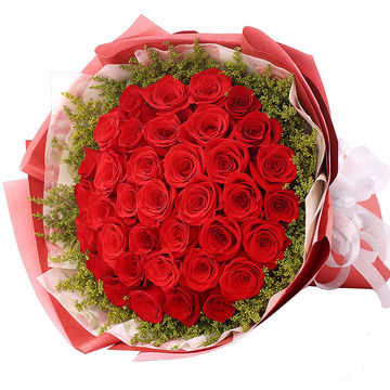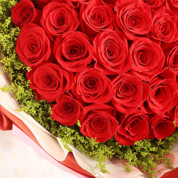 33朵精品红玫瑰,外围搭配适量黄莺