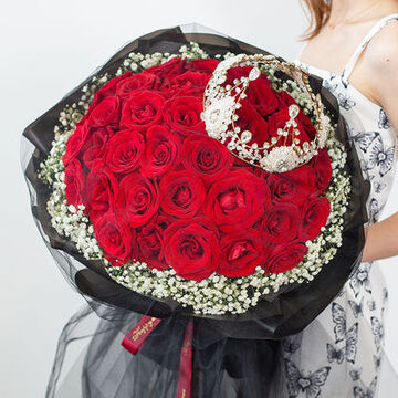 33朵红玫瑰,搭配满天星。皇冠款