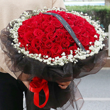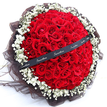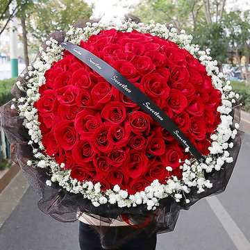 99朵红玫瑰,白色满天星丰满围边,黑色英文缎带搭配