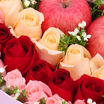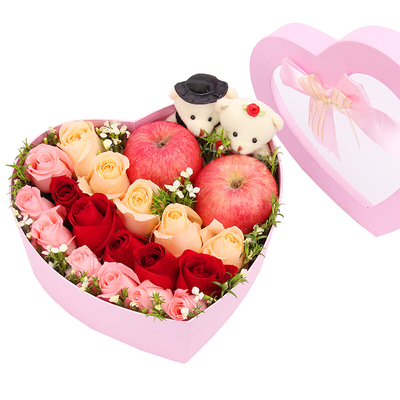 17枝混搭玫瑰(5枝红玫瑰+5枝香槟玫瑰+7枝粉玫瑰),2个苹果,2只小熊,石竹梅搭配。