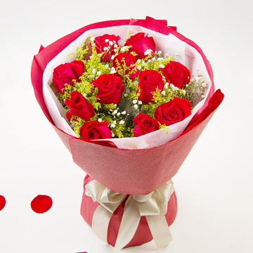 11朵红玫瑰,满天星点缀,黄莺丰满间插。两只可爱小熊