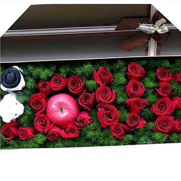 红苹果1颗、红玫瑰33朵、可爱小熊2只,搭配适量天冬门装饰。