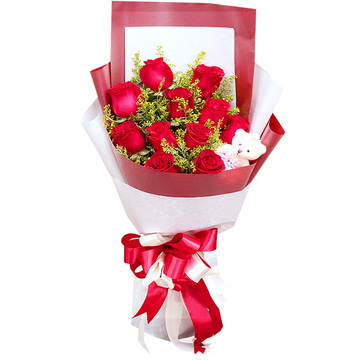 11朵红玫瑰,黄莺丰满间插,一只可爱小熊