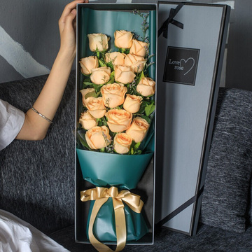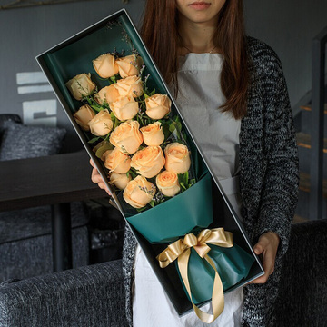 墨绿色欧雅纸扇形包装,黄色缎带束扎,长方形礼盒装花语:千百朵玫瑰在时间中褶皱,褪色。千百句温柔的蜜语在时间中淡忘,消逝,只有我对你的爱在时间中不变,永驻。情人节快乐!爱你久久!附送: