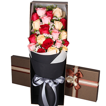 白色欧雅纸和黑色厚牛皮纸扇形包装,银色缎带束扎。方形礼盒装(颜色随机发)花语:我喜欢你,你喜欢我!多少柔情多少密意,只有我们自己才清楚。附送: