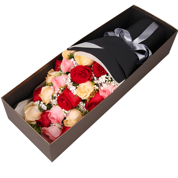 8朵红玫瑰,8朵香槟玫瑰,5朵戴安娜粉玫瑰,粉色石竹梅丰满点缀,黄莺搭配