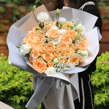 精选33枝香槟玫瑰,白桔梗间插,白色满天星点缀