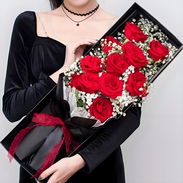 黑色韩素纸多层次包装成心形花语:你就是一朵美丽的玫瑰花,我愿化作玫瑰上的绿叶,默默伴随你,呵护你,直到永远。附送: