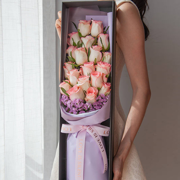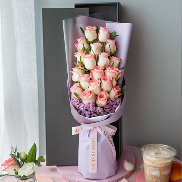 19朵艾莎玫瑰,粉色勿忘我搭配