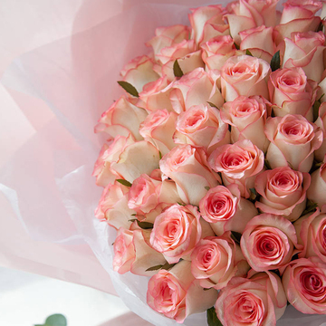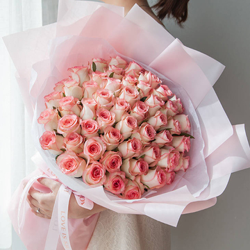 粉色雾面纸、白色雪梨纸、粉色罗纹烫金丝带扎束花语:一生至少该有一次,为了某个人而忘记自己,不求有结果,不求同行,不求曾经拥有,甚至不求你爱我,只求在最美的年华遇见你。附送: