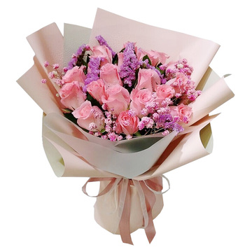 19朵戴安娜粉玫瑰,粉色勿忘我间插,粉色满天星点缀