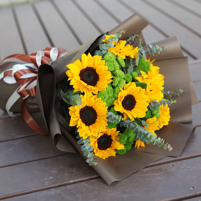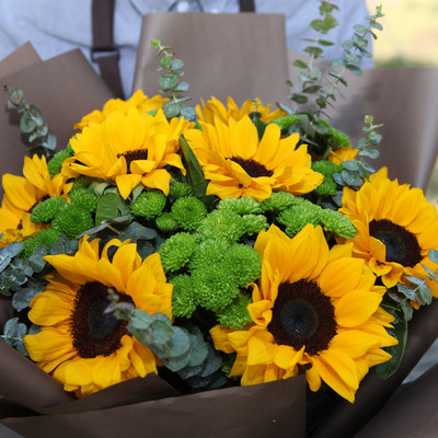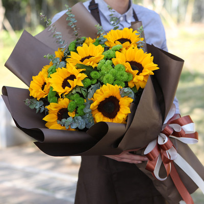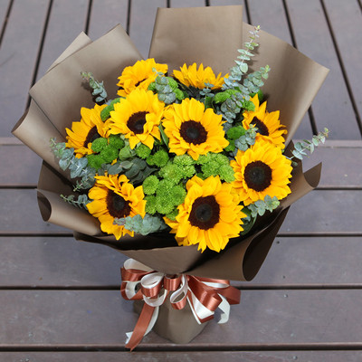 9朵向日葵搭配绿色小雏菊、尤加利。