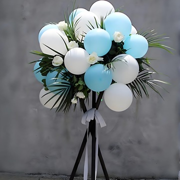 8个蓝色气球,8个白色气球,适量白玫瑰间插,绿叶搭配,散尾叶间插
