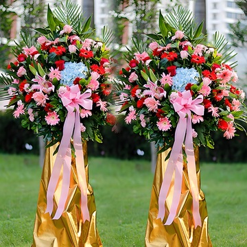 经典开业花篮,金箔纸包装,粉色缎带蝴蝶结装饰。(单个)花语:昌期开景运,泰象启阳春。附送: