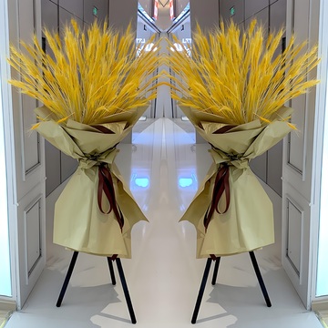 三角架花篮,卡其色欧雅纸韩式包装,咖啡色缎带束扎。花语:红红火火,大卖!附送: