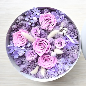 7朵永生花玫瑰、绣球、苔藓、黄金球