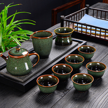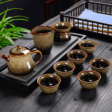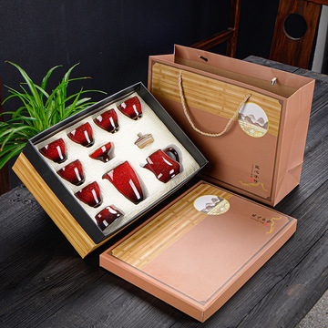 窑变功夫茶具套装 陶瓷拉丝茶壶茶杯礼盒 10头红兔毫茶壶